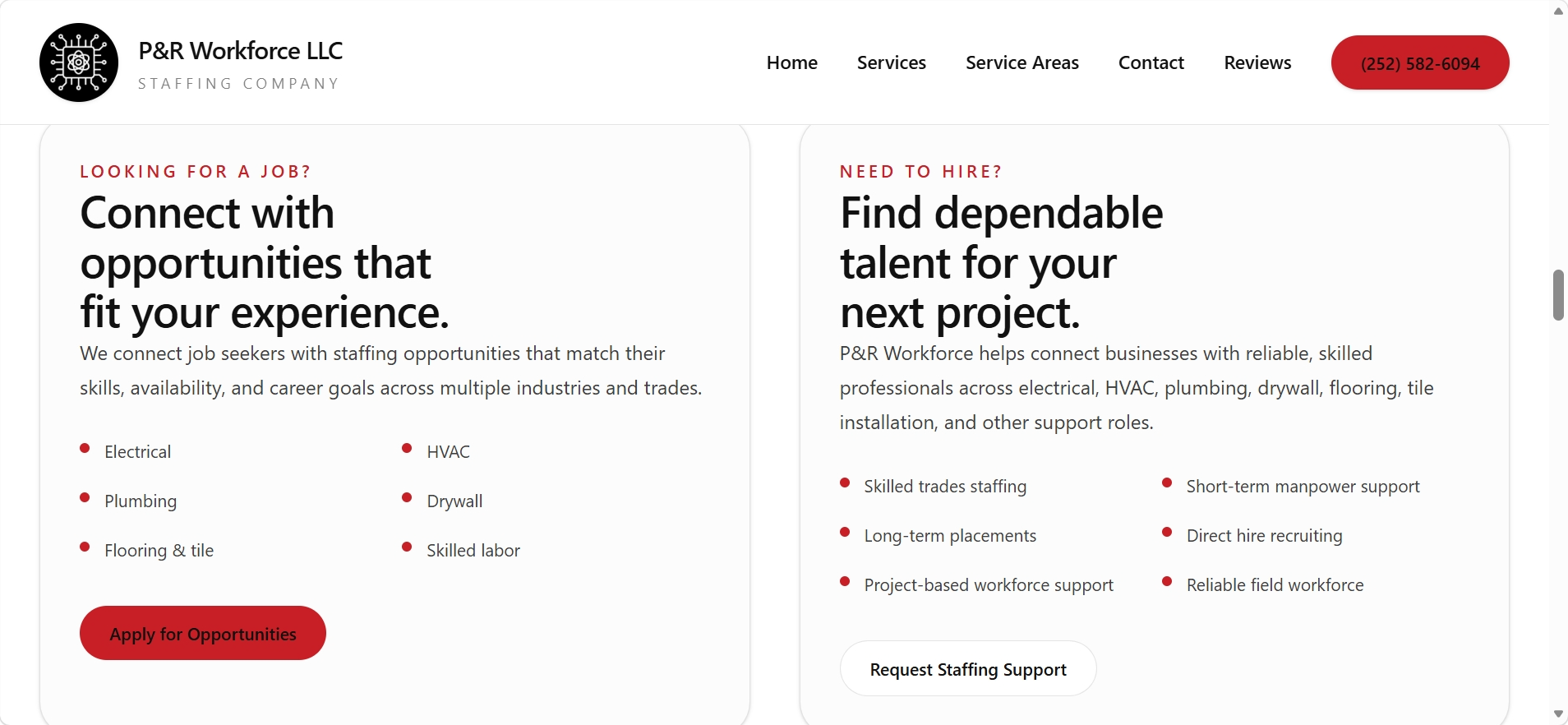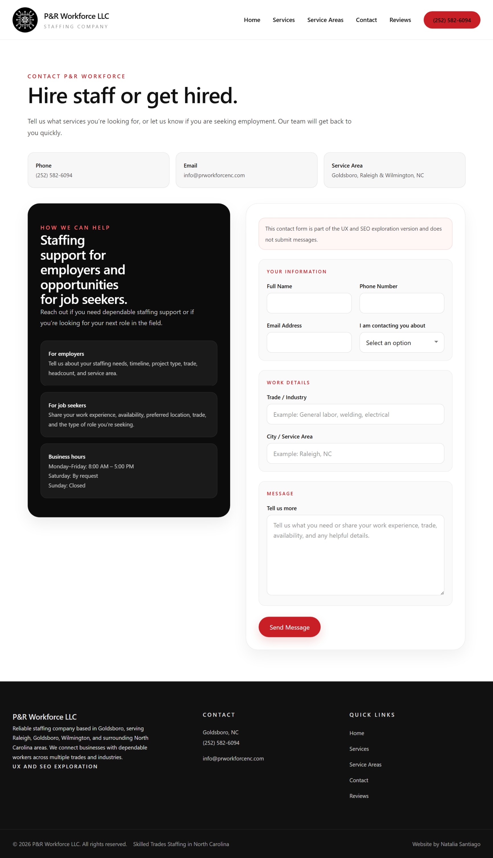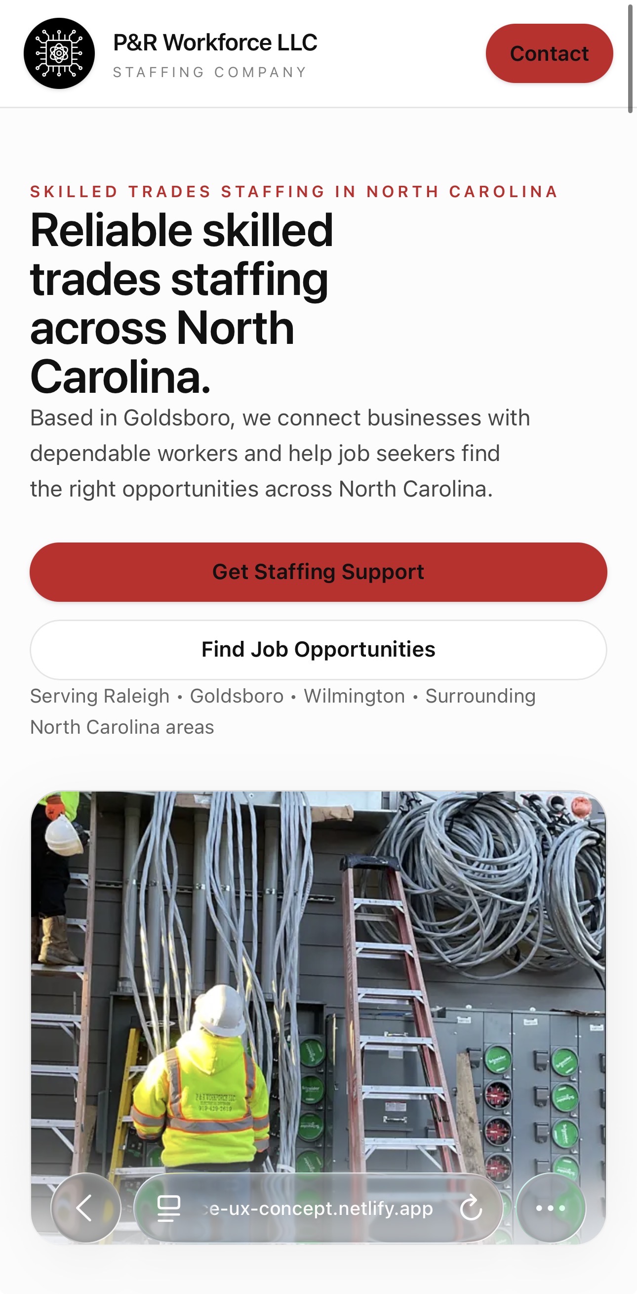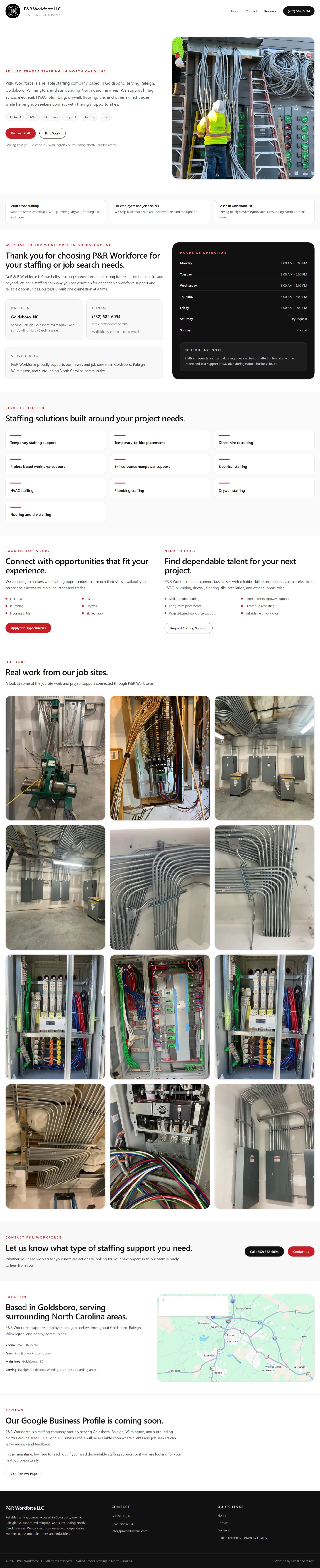 This project reimagines the P&R Workforce LLC website with a stronger focus on clarity, usability, and conversion. The exploration prioritizes faster decision making, clearer service discovery, and stronger local SEO structure so users can more quickly understand whether they are hiring or looking for work and what to do next.