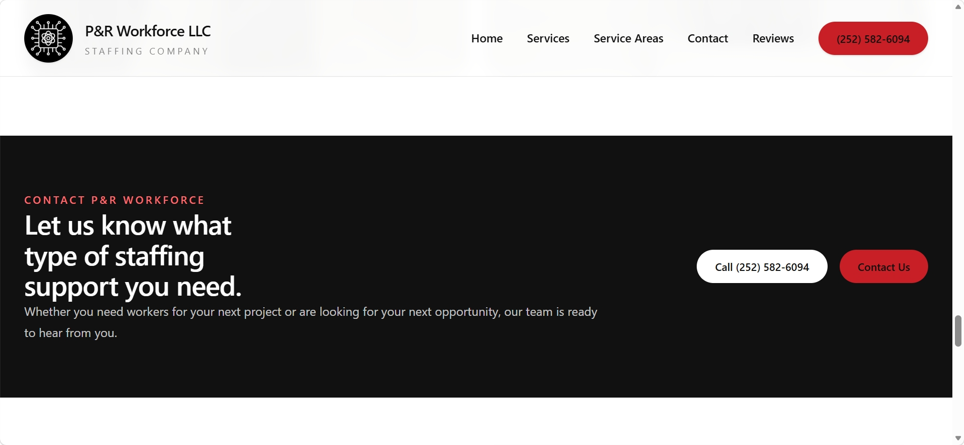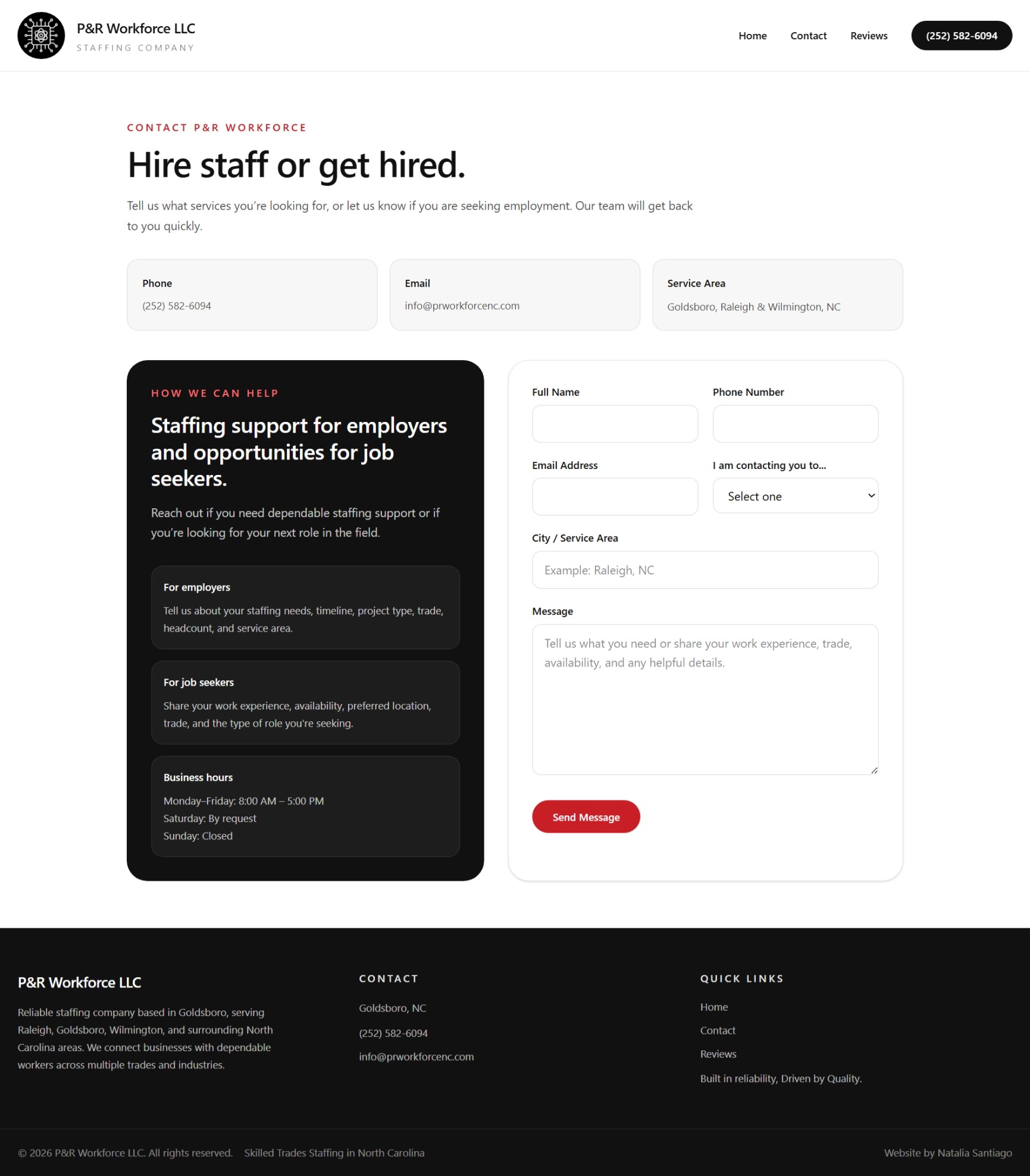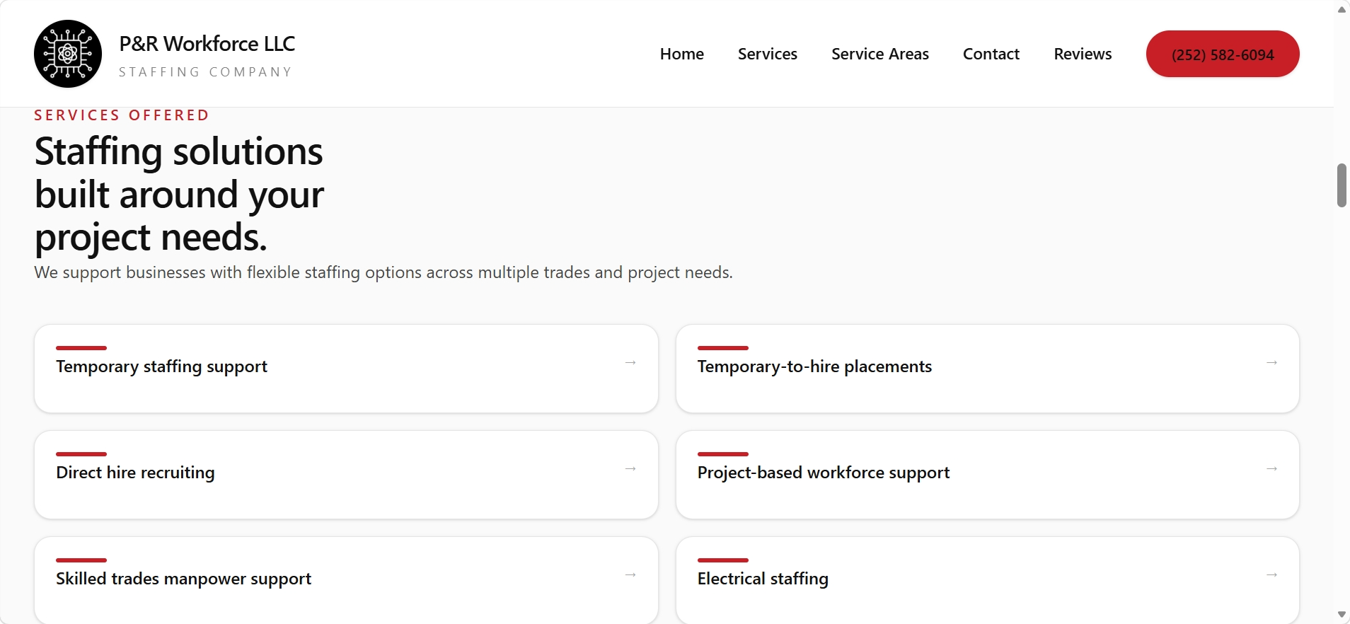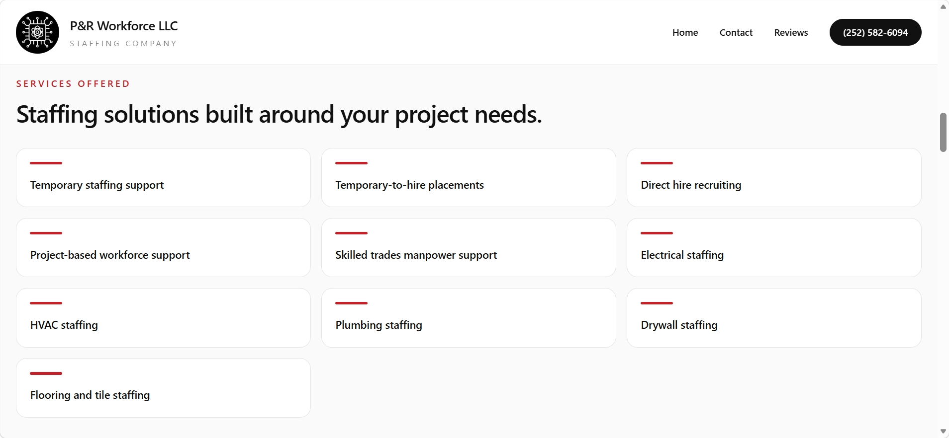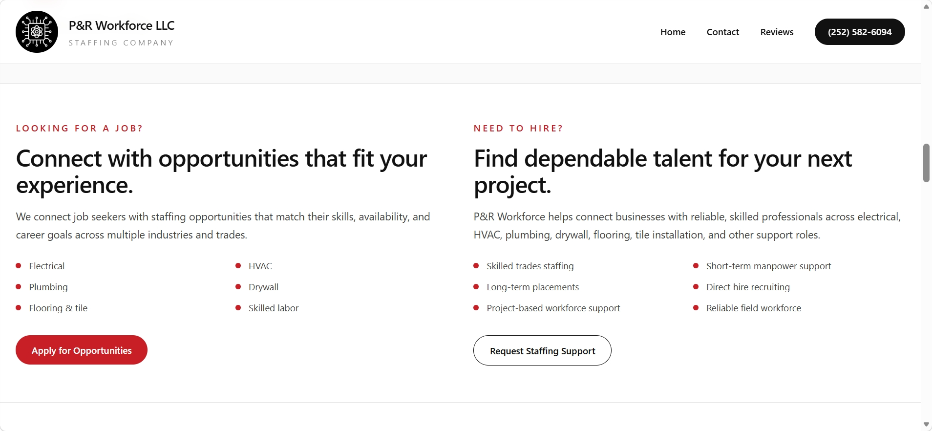 This project reimagines the P&R Workforce LLC website with a stronger focus on clarity, usability, and conversion. The exploration prioritizes faster decision making, clearer service discovery, and stronger local SEO structure so users can more quickly understand whether they are hiring or looking for work and what to do next.